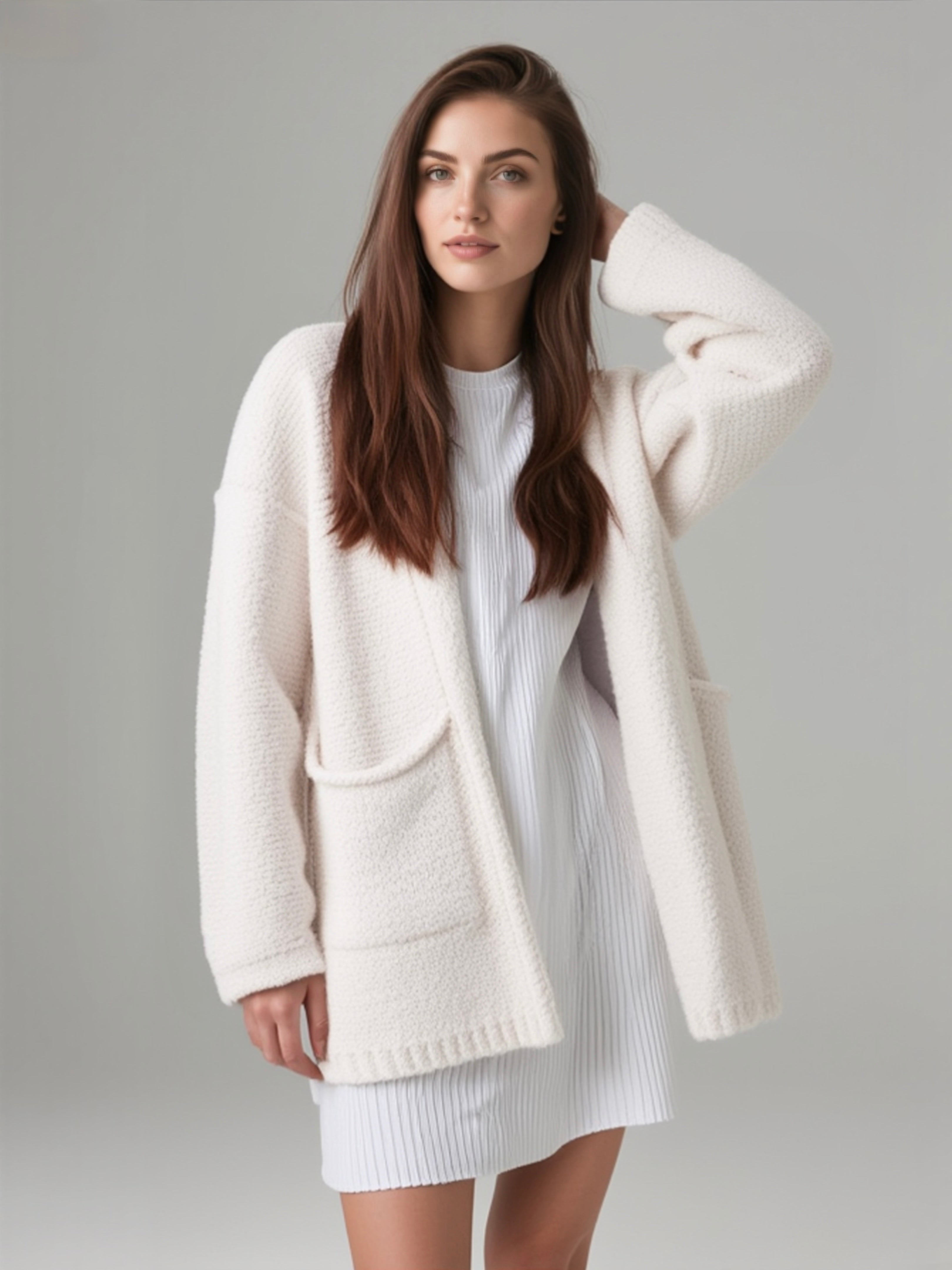 Schöner kuschelweicher Cardigan aus locker fallendem Bouclé, vorne offen mit seitlichen Taschen und langen Ärmeln, Rippbündchen am Armel und Saum.