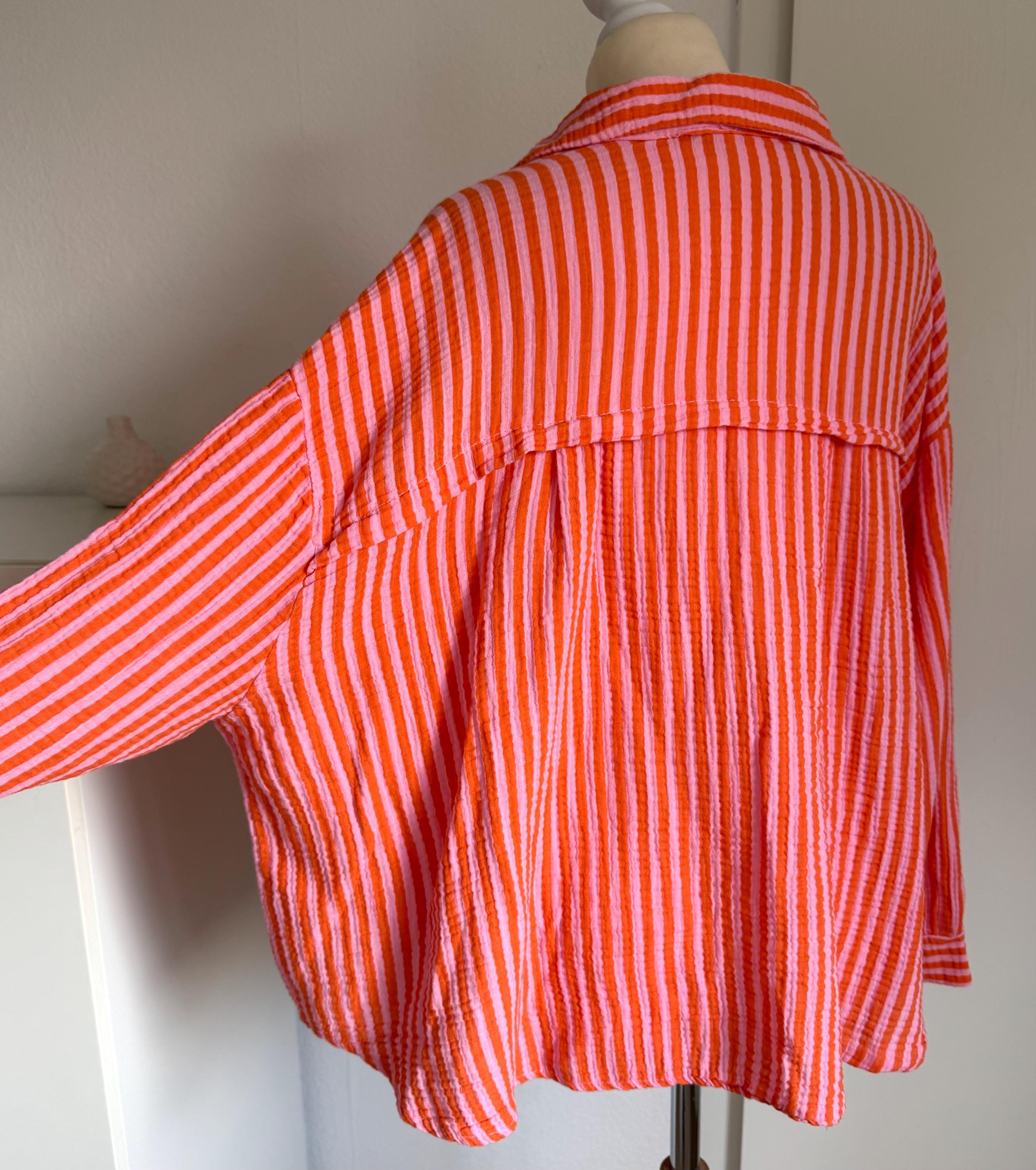 Weiche bequeme oversized Bluse aus Musselinstoff in einer wunderschönen Farbe. Lässiger Schnitt mit durchgehender Perlmutt-Knopfleiste.