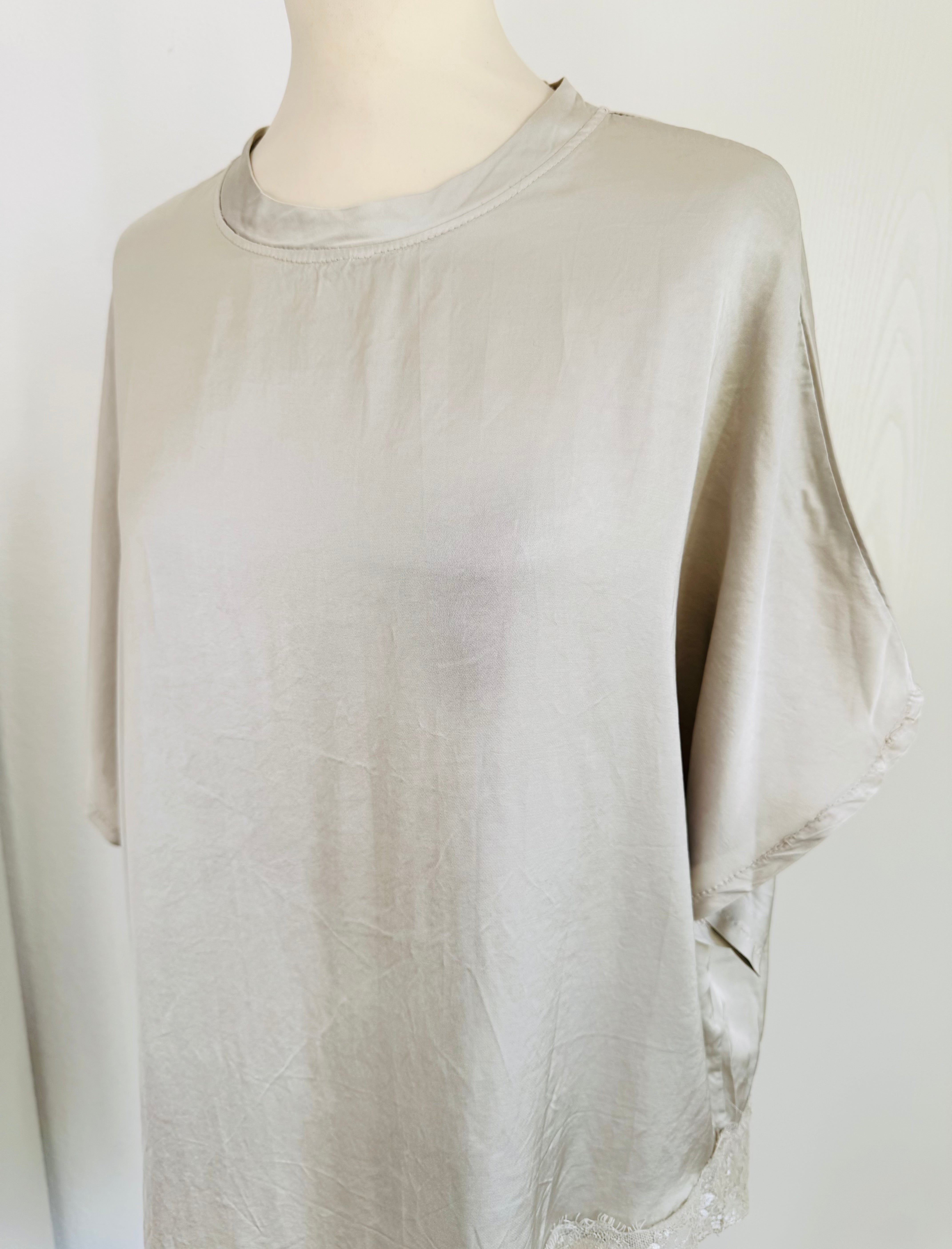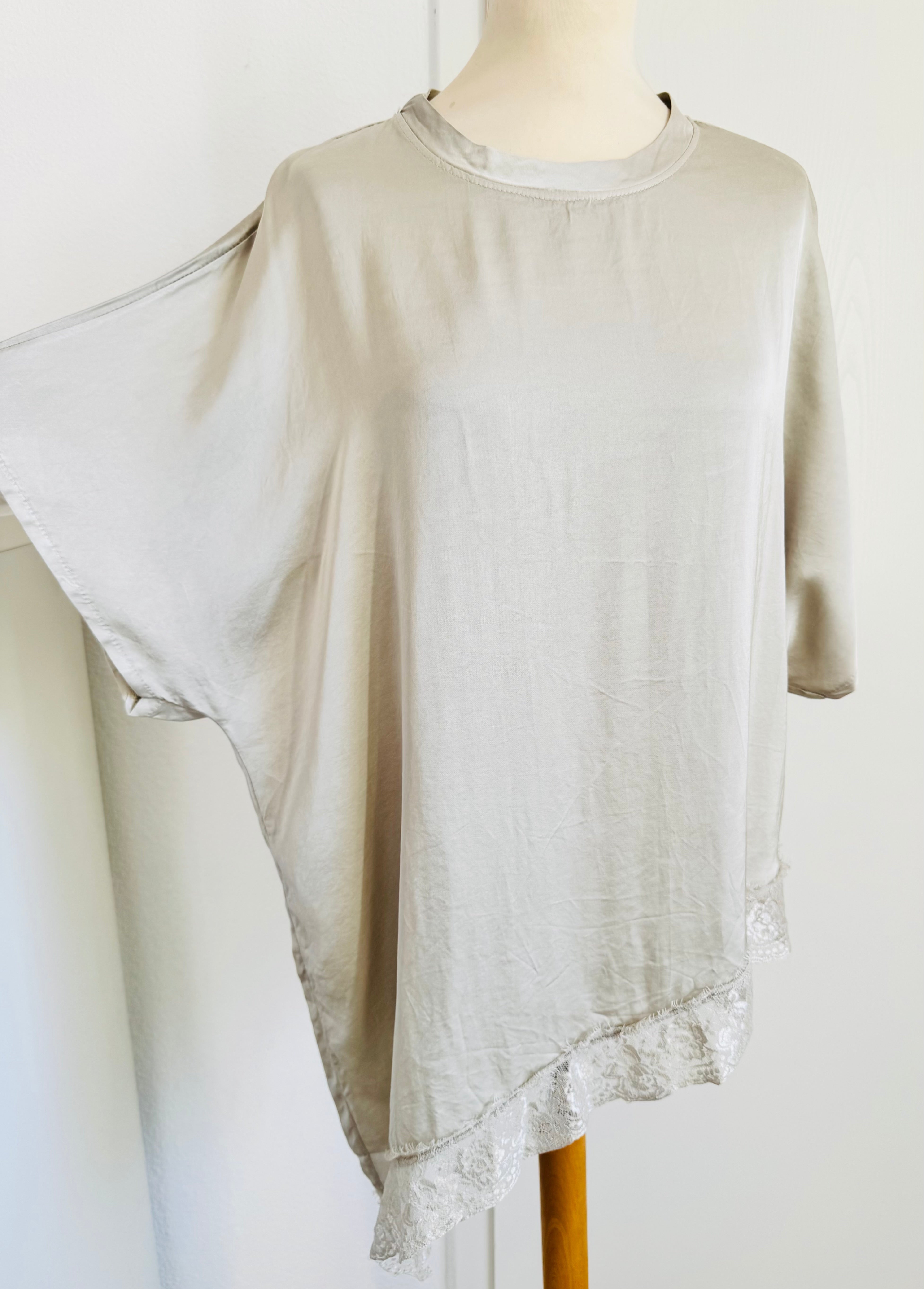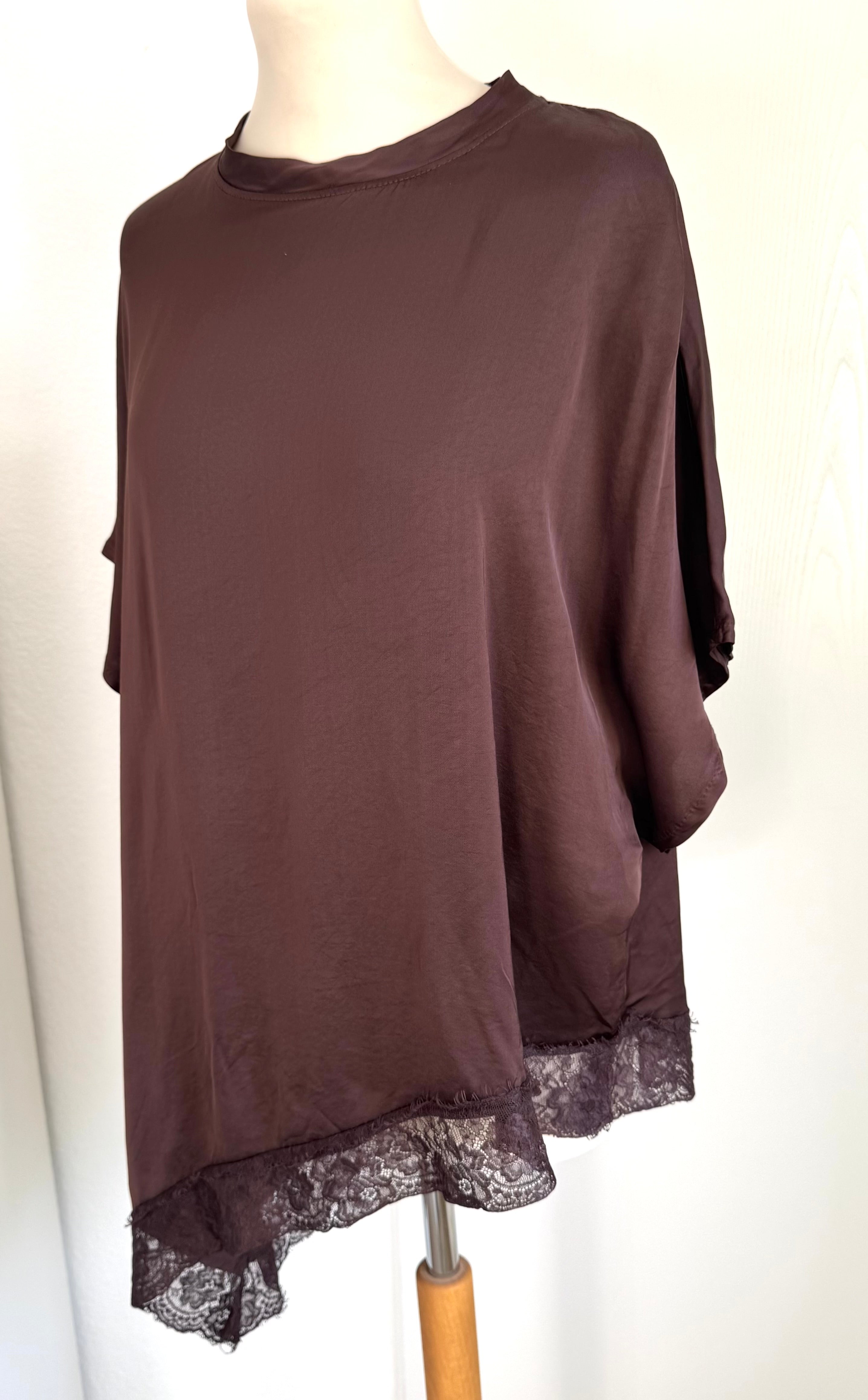 Edles asymethrisches Satinshirt mit Spitzen am Saum.