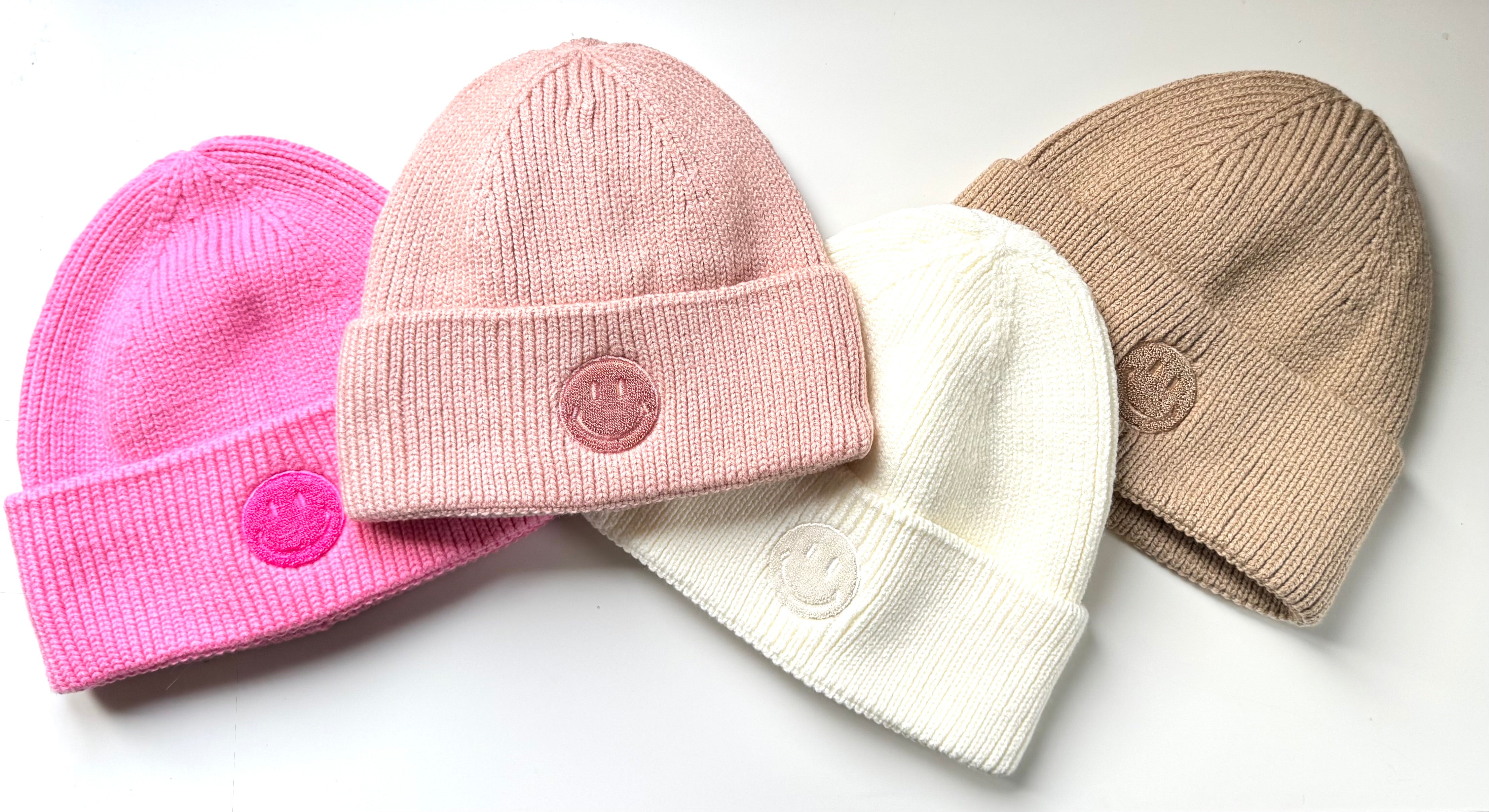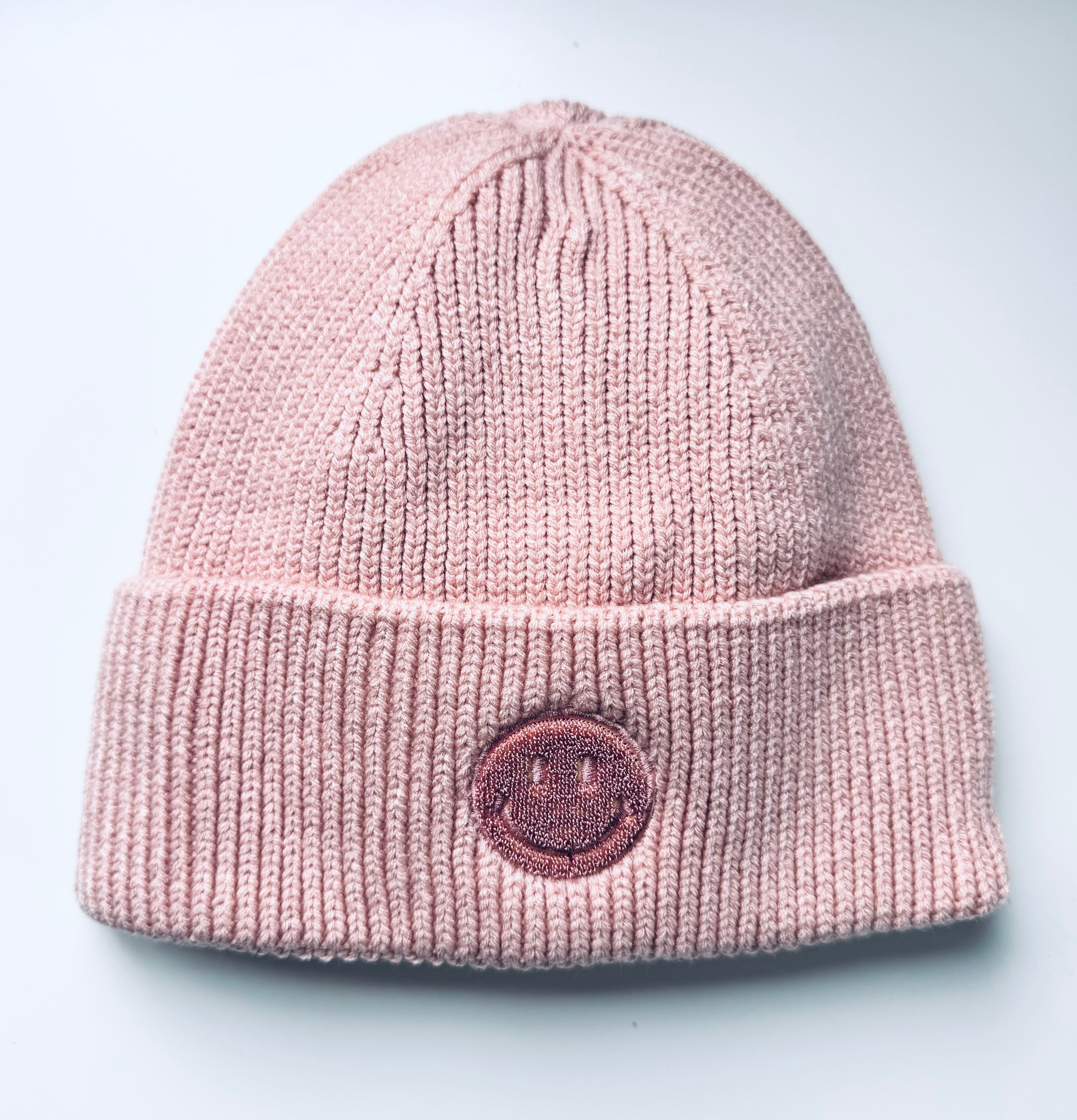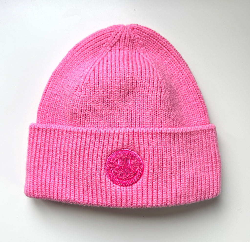 Superschöne Strickmütze mit Smiley-Aufnäher.