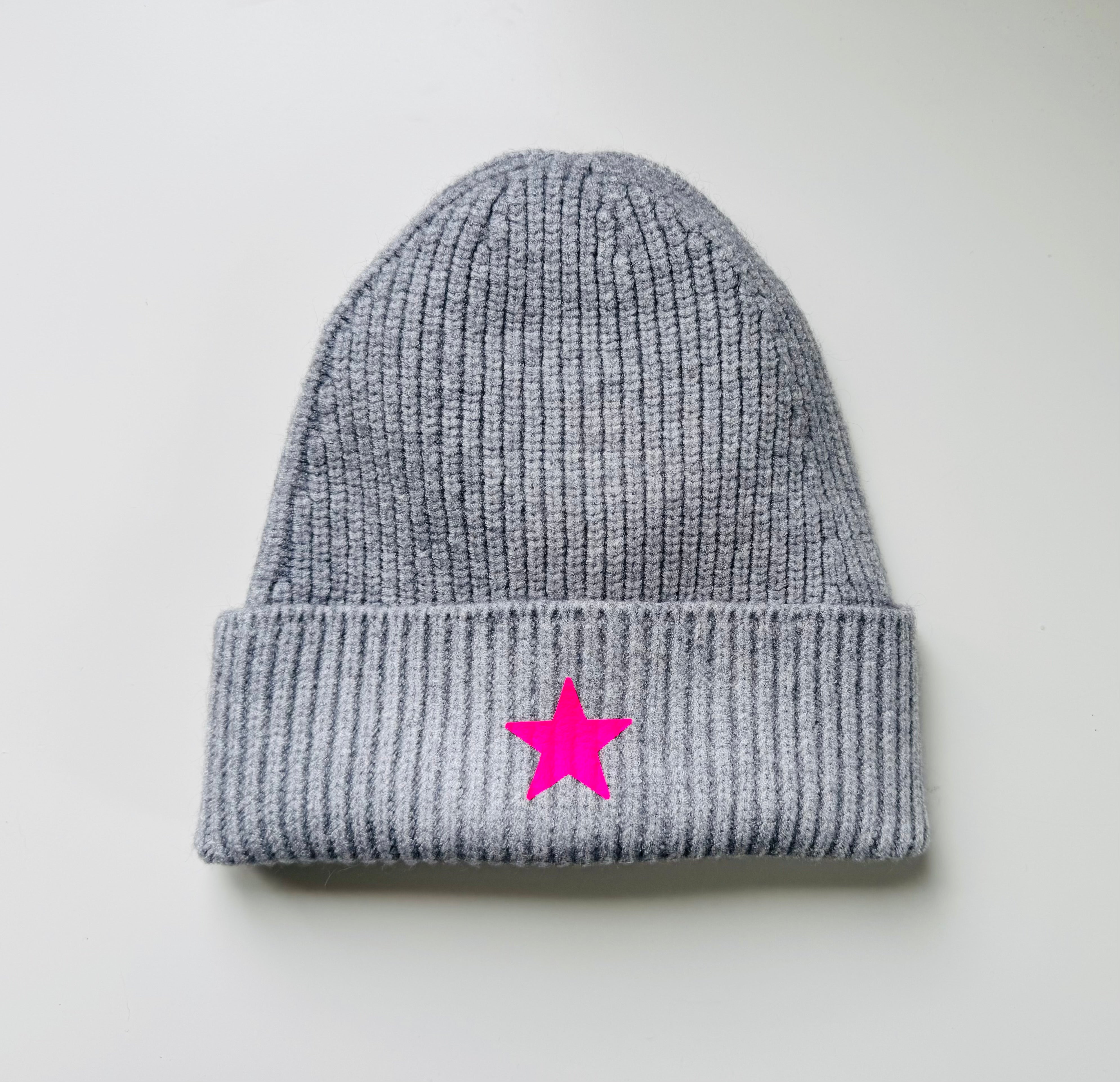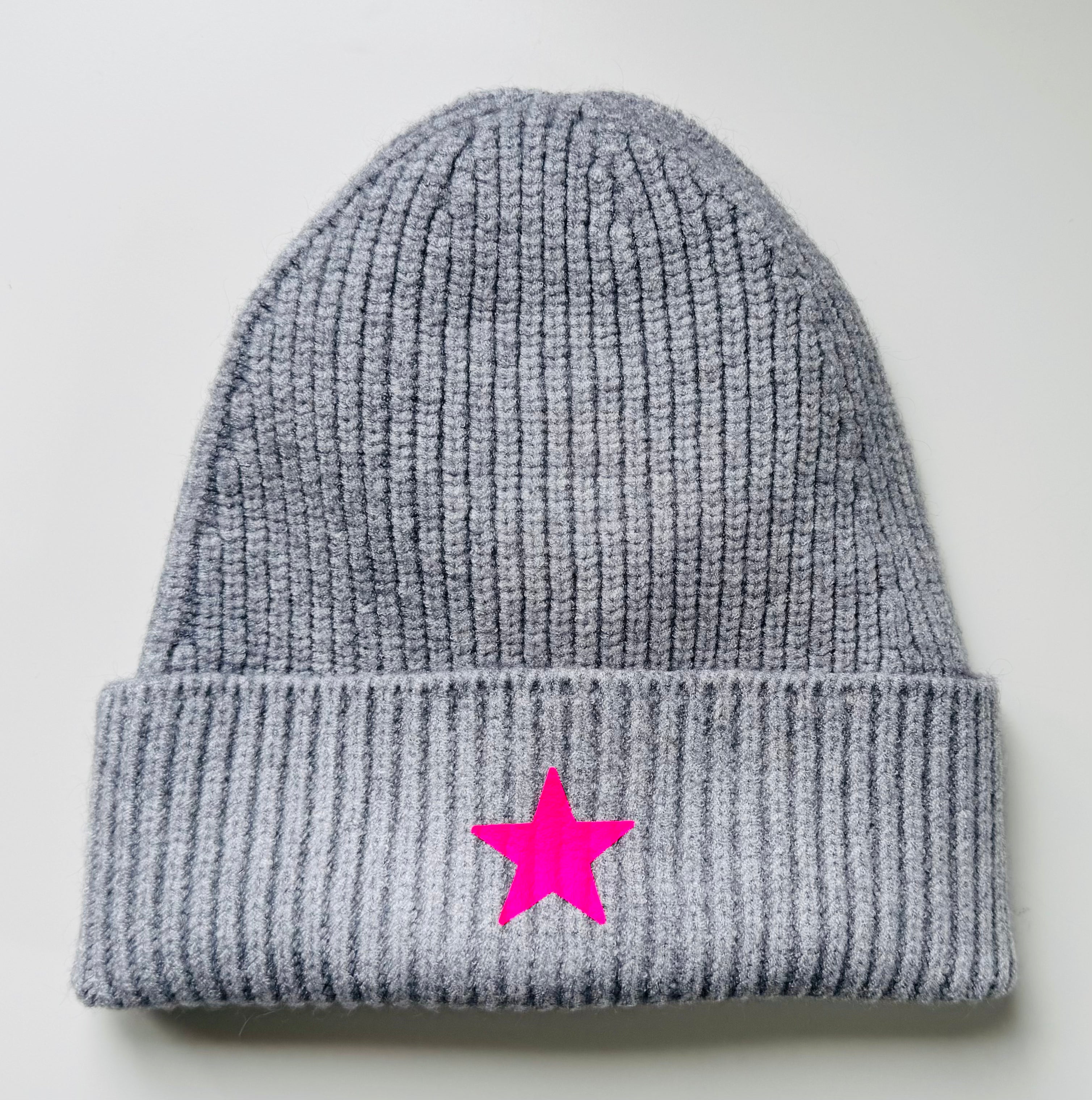 Beanie Stern weiche Strick-Mütze - Hellgrau/Neonpink