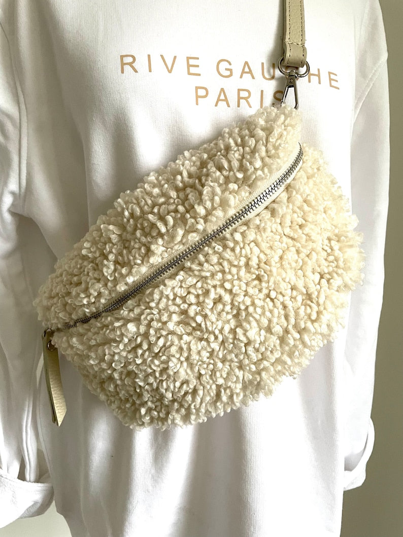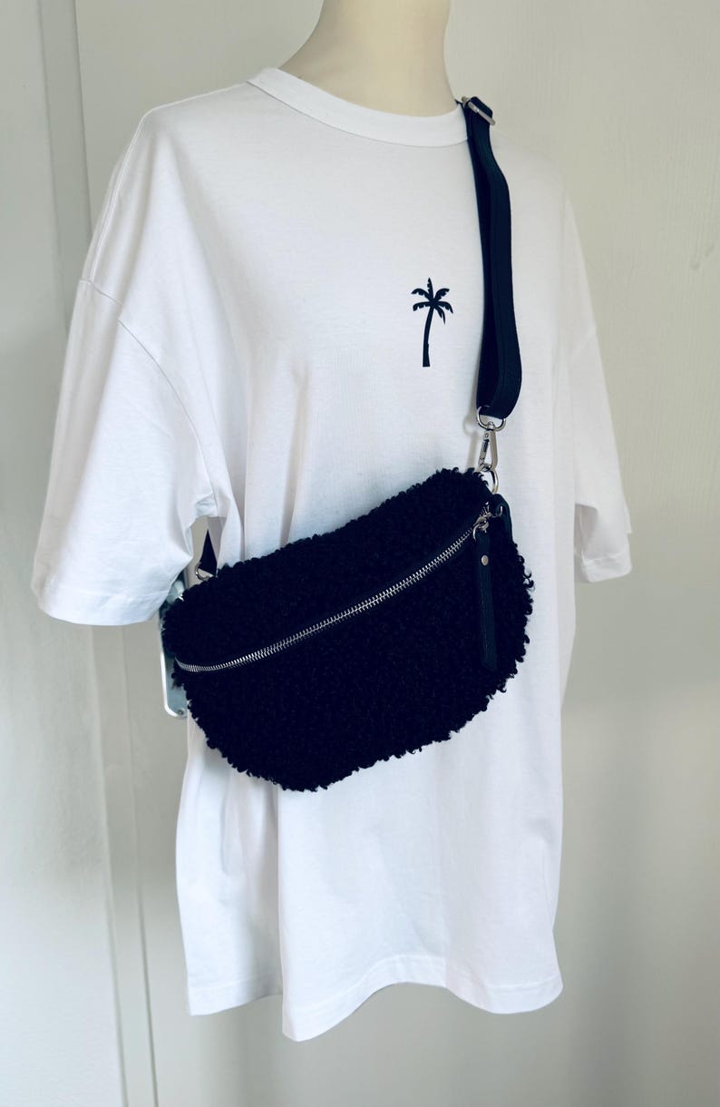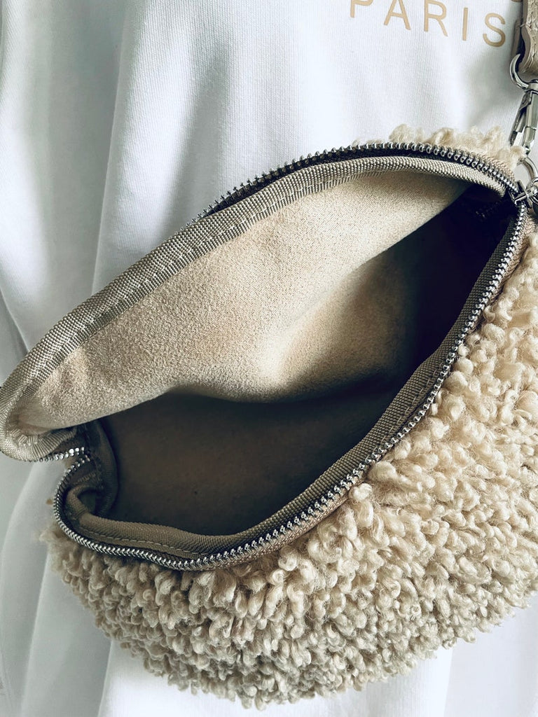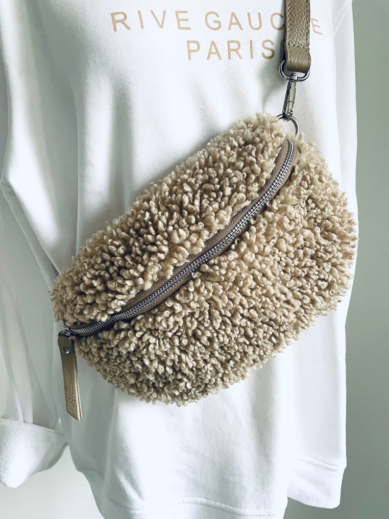 Crossbody Teddyplüsch-Tasche mit verstellbarem Strap aus Echtleder.