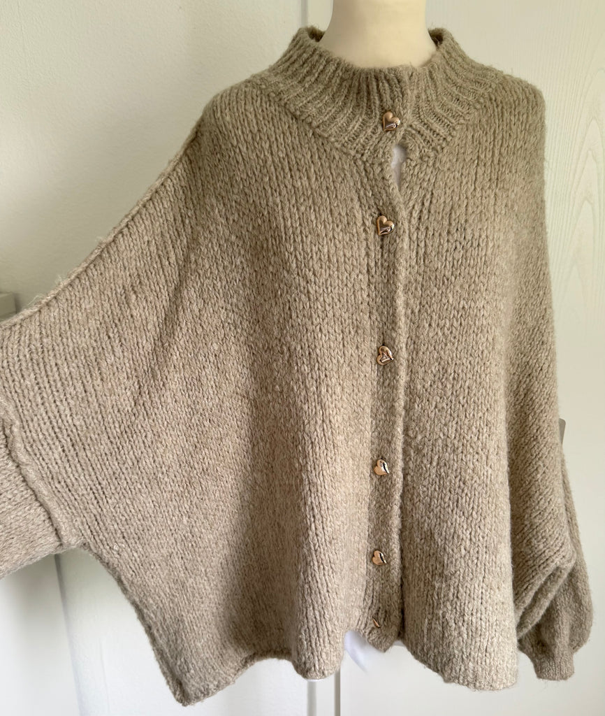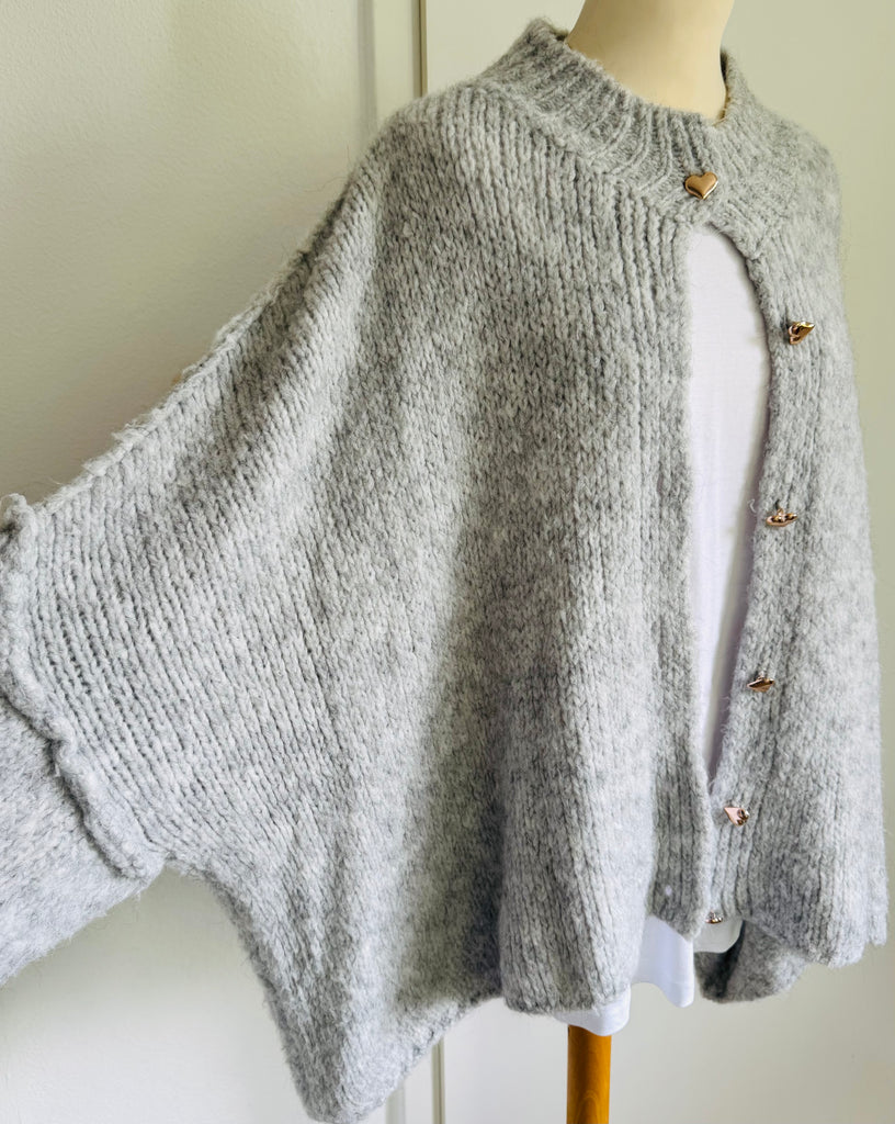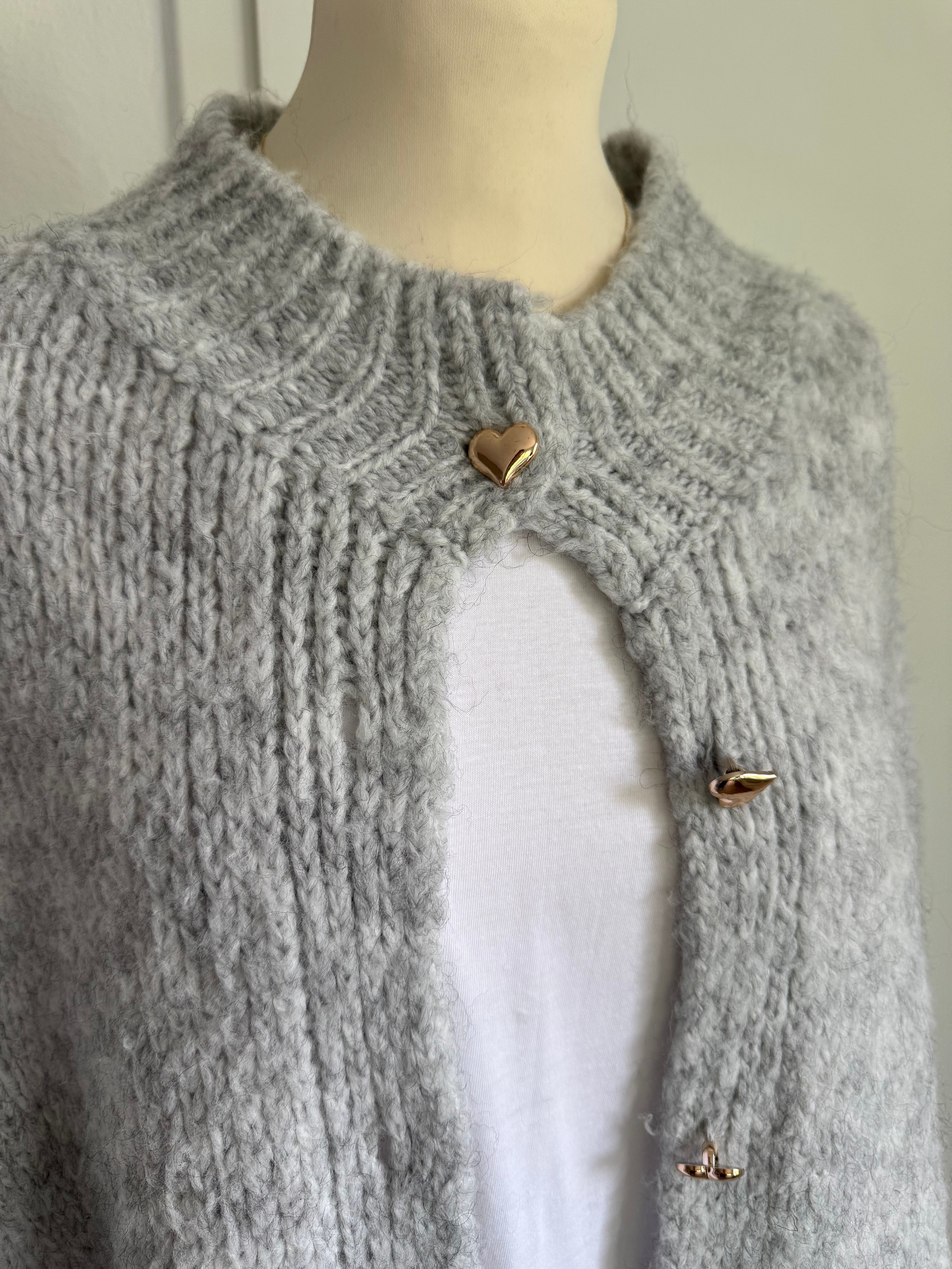 Flauschiger oversized Cardigan mit golden Herz-Knöpfen - Light Grey